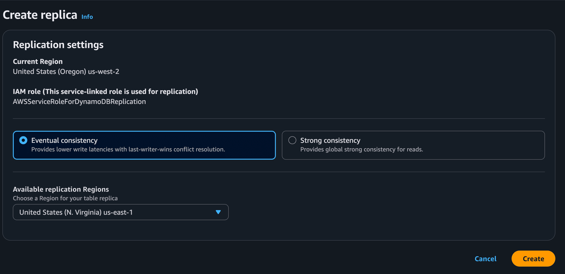 To set that up: DynamoDB → Tables → Actions → Create Replica, choose your region and consistency, and hit Create.